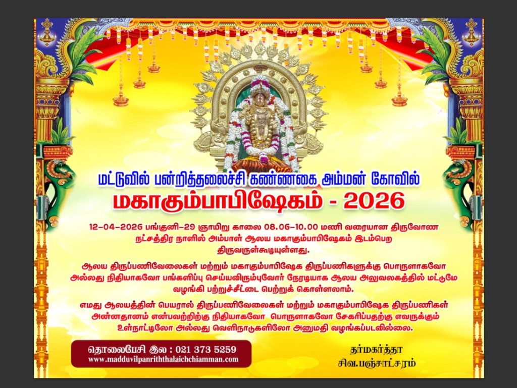12-04-2026 பங்குனி-29 ஞாயிறு காலை 08.06 -10.00 மணி வரையான திருவோண நட்சத்திர நாளில் அம்பாள் ஆலய மகாகும்பாபிஷேகம் இடம்பெற திருவருள்கூடியுள்ளது.